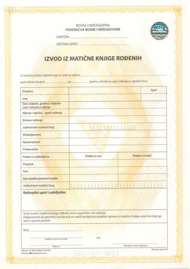U Federaciji Bosne i Hercegovine (FBiH) zabilježena je nestašica obrazaca za izdavanje izvoda iz matičnih knjiga rođenih i uvjerenja o državljanstvu.