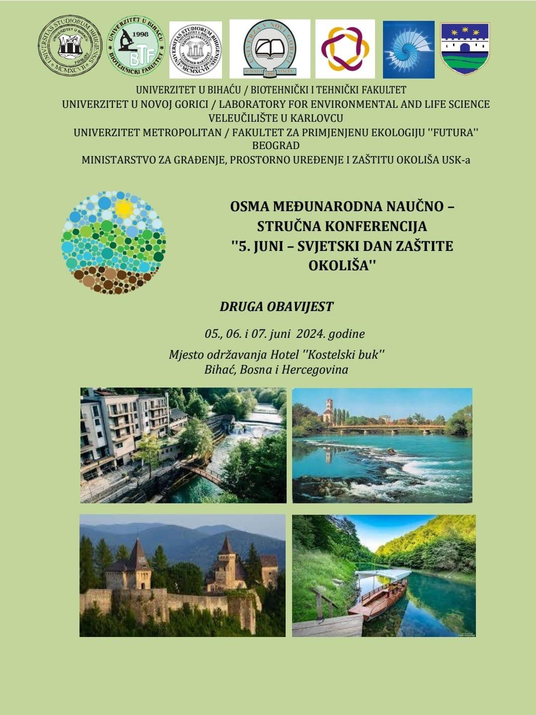 Biotehnički fakultet, u saradnji sa Ministarstvom za građenje, prostorno uređenje i zaštitu okoliša Unsko-sanskog kantona, povodom 5.juna, svjetskog dana zaštite okoliša, najavljuje 8. međunarodnu naučno - stručnu konferenciju, koja će se održati od 5. do 7. juna u Bihaću