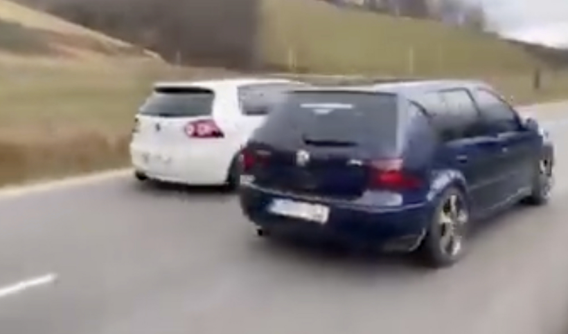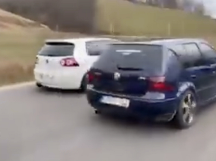 Na snimku objavljenom na društvenim mrežama, dva automobila marke “Golf” utrkivala su se na uskoj gradskoj cesti, a samo pukom srećom, niko nije stradao.