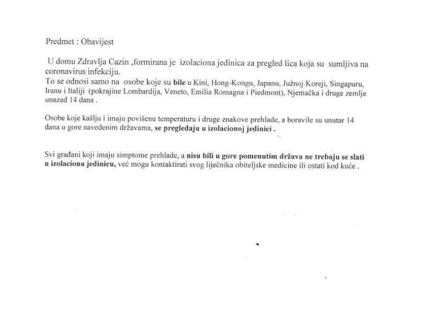 CAZIN 13 Mar, 2020 - 10:20 / Uredio: anita / 0 Comments U Domu Zdravlja Cazin osposobljena izolaciona prostorija CAZIN U Domu Zdravlja Cazin formirana je izolaciona jedinica za pregled lica za koje se sumnja da su zaraženi korona virusom. Cijelo saopštenje pročitajte u prilogu: Image Dom zdravlja Cazin Related Articles CAZIN 05 Dec, 2025 Zlatna Cazinjanka: Belma Mahmutagić među najboljim studentima Univerziteta CAZIN KRAJINA 04 Dec, 2025 Saobraćajna nesreća u Cazinu: ‘Vozač udario više vozila u pokretu i pobjegao’ CAZIN 04 Dec, 2025 Saobraćajna nesreća u Cazinu: Vozilo završilo pored ceste CAZIN 04 Dec, 2025 Udes u Cazinu, vozilo završilo van puta - evo detalja CAZIN 04 Dec, 2025 Cazin: Upali u firmu i pretukli portira – potraga za napadačima CAZIN 03 Dec, 2025 Cazin: Igrao u kladionici pa odbio platiti – evo detalja