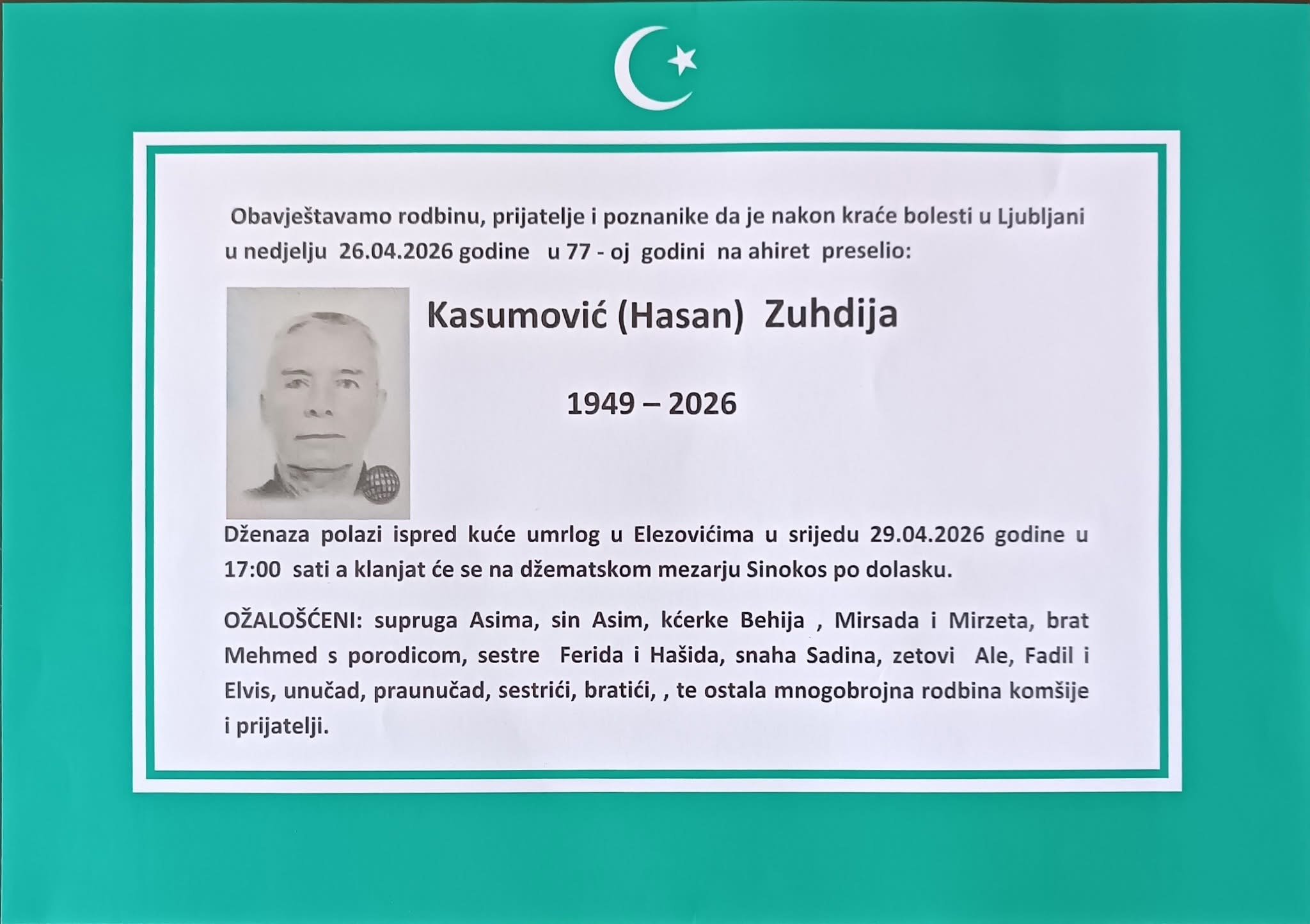 Obavještavamo rodbinu, prijatelje i poznanike da je nakon kraće bolesti u Ljubljani u nedjelju 26.04.2026 godine u 77-oj godini na ahiret preselio: