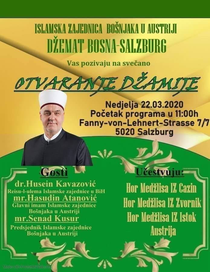 Zbog nedovoljnog prostora u džamiji, ceremonija otvaranja džamije će se održati u Wyndham Grand Hotel (konferencijska sale), u Salzburgu.