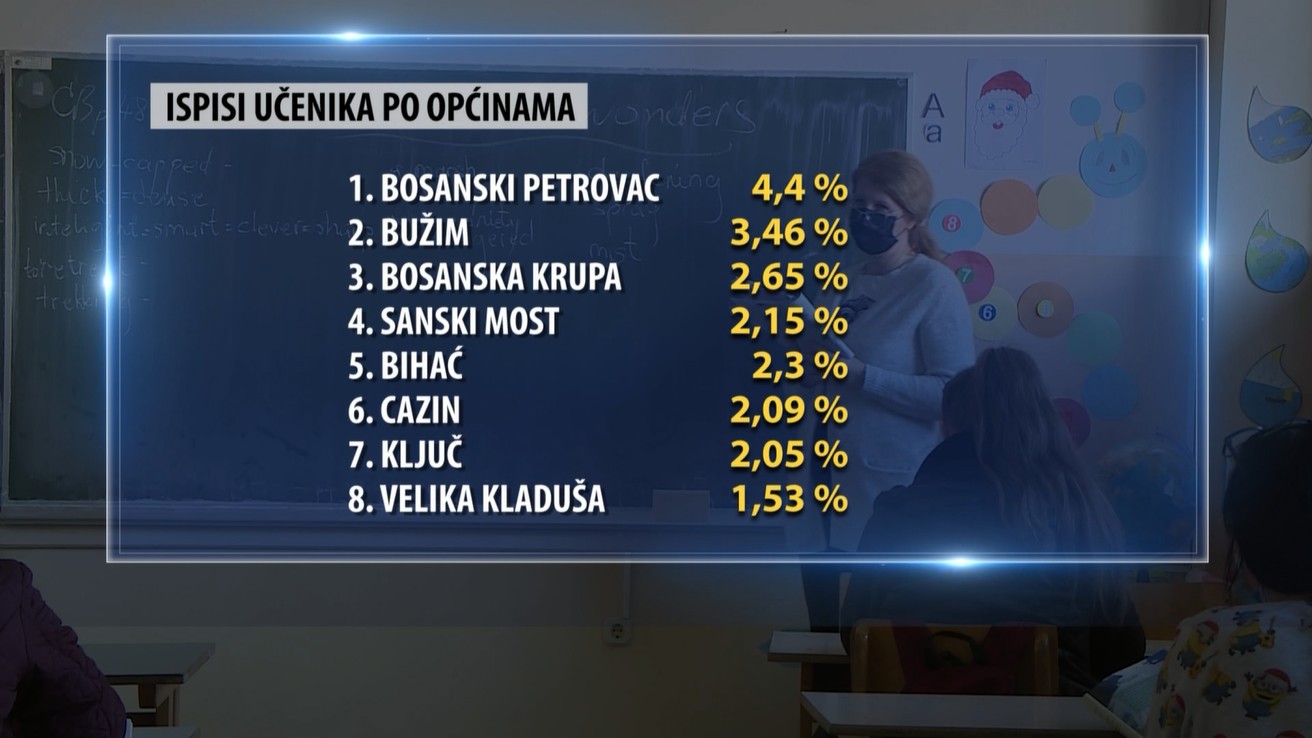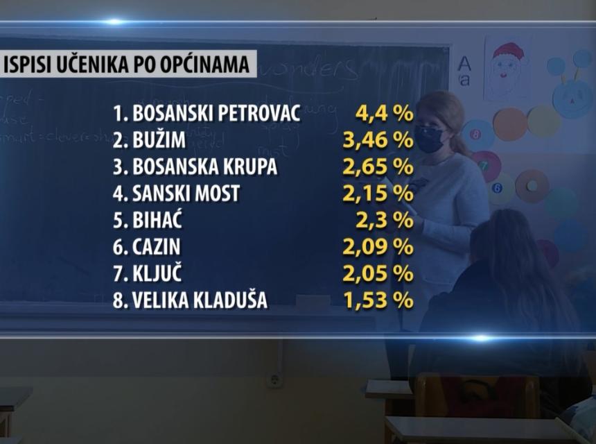 Kada je riječ o Unsko-sanskom kantonu adresu je promijenilo najviše učenika iz većih sredina poput Bihaća, a ovaj nadasve zabrinjavajući trend, zabilježen je u ostalim općinama. Procentualno, u odnosu na ukupan broj učenika po općinama, najviše ih se ispisalo iz škola u Bosanskom Petrovcu, ukupno 4, 4 posto, a najmanjeu Velikoj Kladuši, 1, 53 posto.