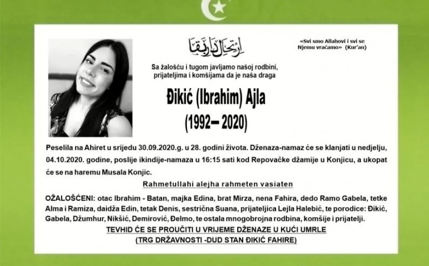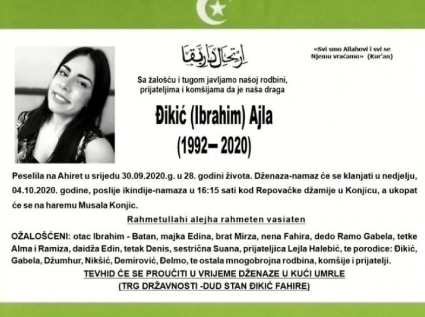 Dženaza Ajli Đikić klanjat će se u nedjelju 4. oktobra poslije ikindije-namaza u 16:15 sati kod repovačke džamije u Konjicu, a ukop će biti obavljen u haremu Musala.