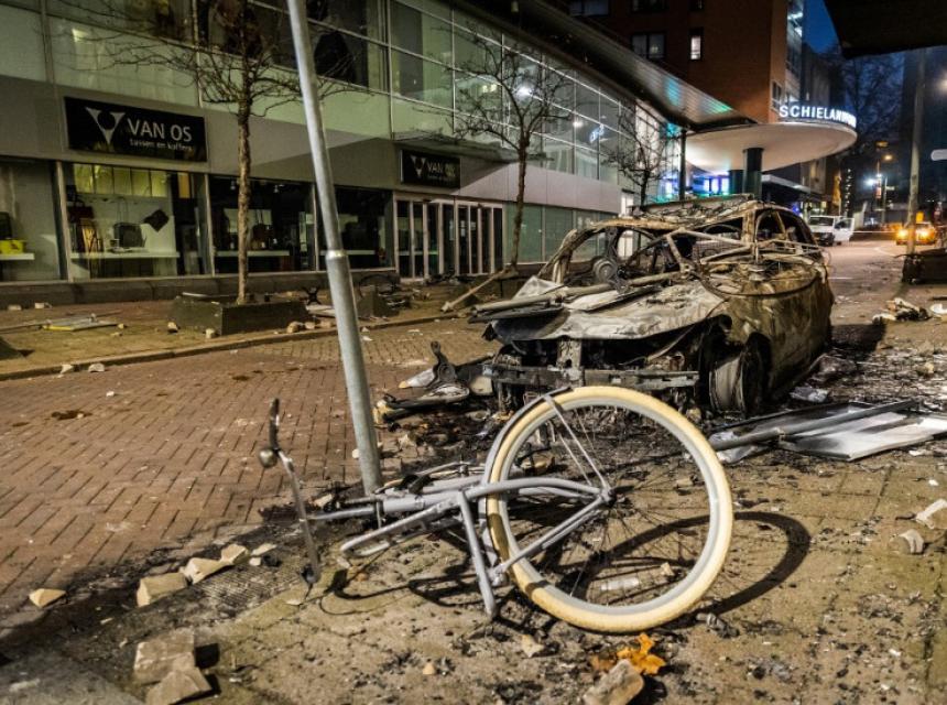Demonstranti su napali policiju i palili bicikle u Hagu, u noći nakon što su protesti u Roterdamu postali nasilni i policija je otvorila vatru te ranila najmanje tri osobe.