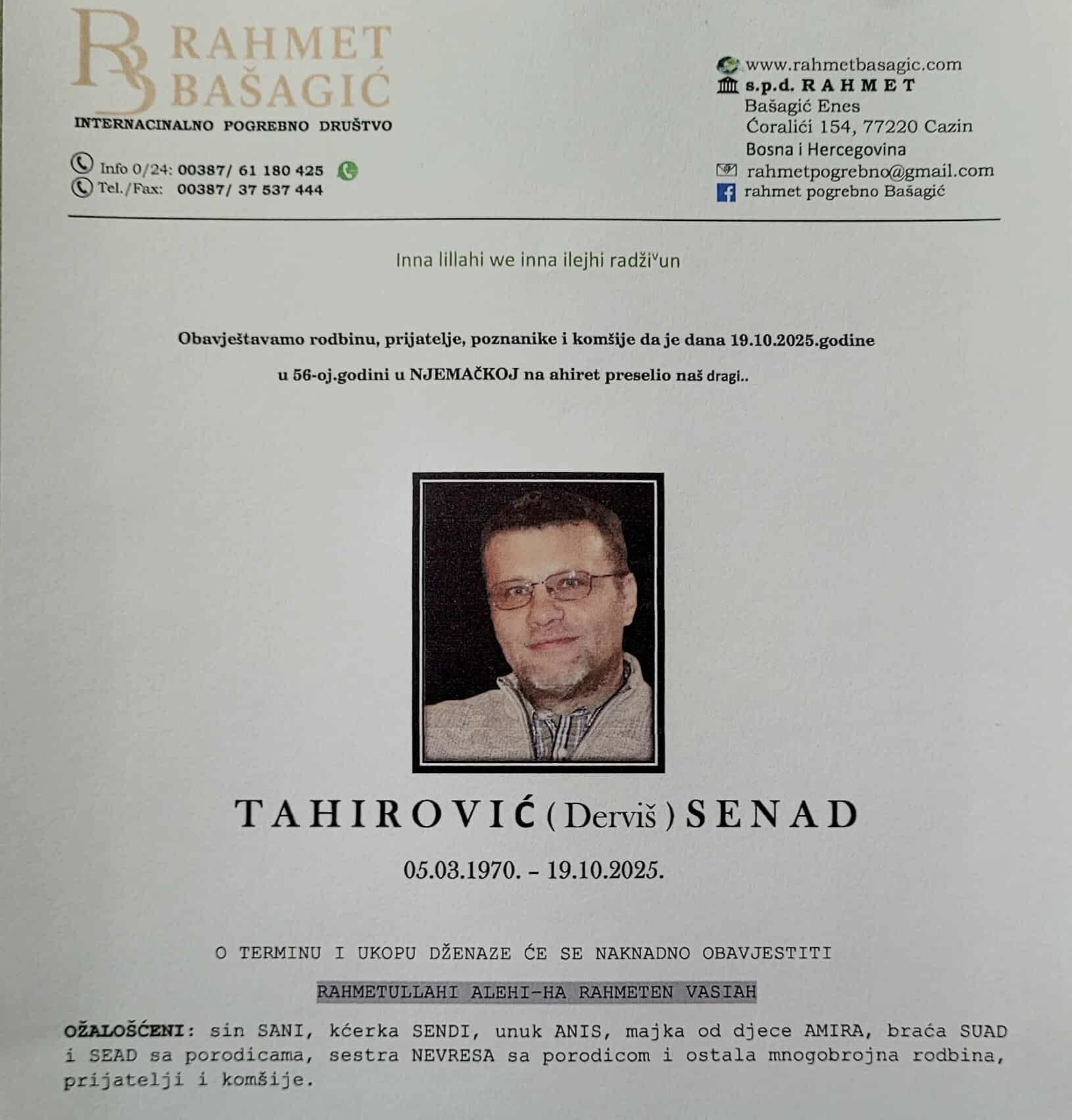 Obavještavamo rodbinu, prijatelje, poznanike i komšije da je dana 19.10.2025. godine u 56-oj godini u Njemačkoj, na ahiret preselio naš dragi