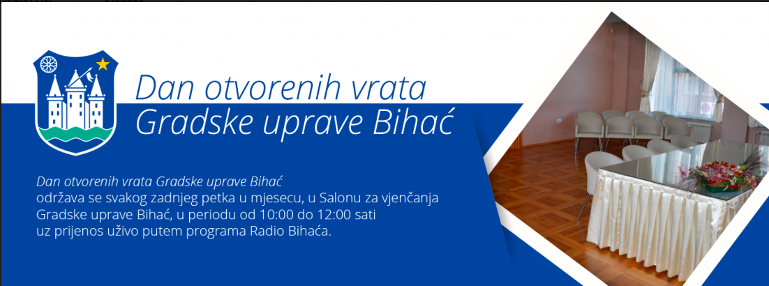 Dan otvorenih vrata Gradske uprave Bihać održavati će se svakog zadnjeg petka u mjesecu, u Salonu za vjenčanja Gradske uprave Bihać, u periodu od 10:00 do 12:00 sati. Građani će u petak 24.novembra 2017. godine imati priliku da komuniciraju sa čelnim ljudima izvršne i zakonodavne vlasti Grada Bihaća.