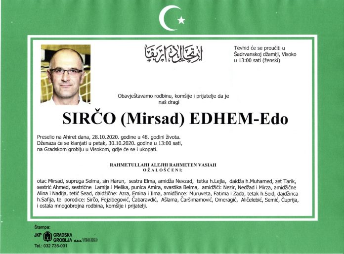 Dženaza će se obaviti u petak (30. oktobar) u 13:00 sati, na Gradskom groblju Visoko, gdje će se i ukopati.
