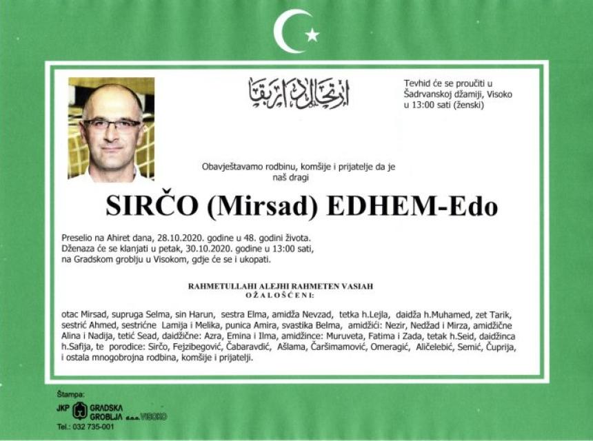 Edhem Sirčo rođen je 20. septembra 1973. godine u Visokom. Bio je dugogodišnji reprezentativac BiH. Igrao je na poziciji desnog beka šutera, a osim što je nastupao za RK Bosna Visoko, branio je boje i sarajevske Bosne, te Izviđača i Sloge iz Doboja.