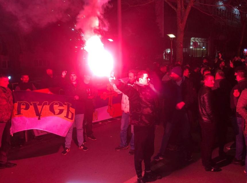 Nekoliko desetina okupljenih nosili su srpske, ruske i zastave carske Rusije, kao i transparent: “Moli se Bogu, drži se Rusije”.
