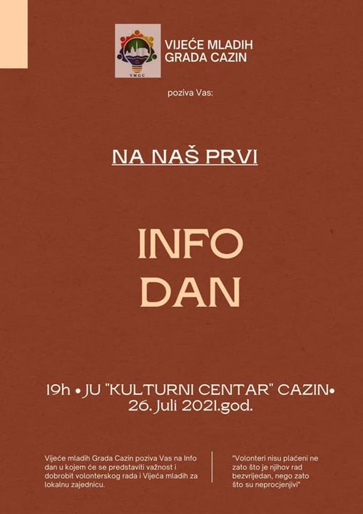 Tako i naše vijeće mladih grada Cazina javlja da u ponedjeljak, 26.juli 2021. godine s početkom u 19h bit će održan info dan o našem vijeću, putu ka učlanjenu, obavezama, privilegijama, pričat će se o svemu što smo radili i što ćemo u sklopu opcija mobilnosti VMGC-a i raditi!