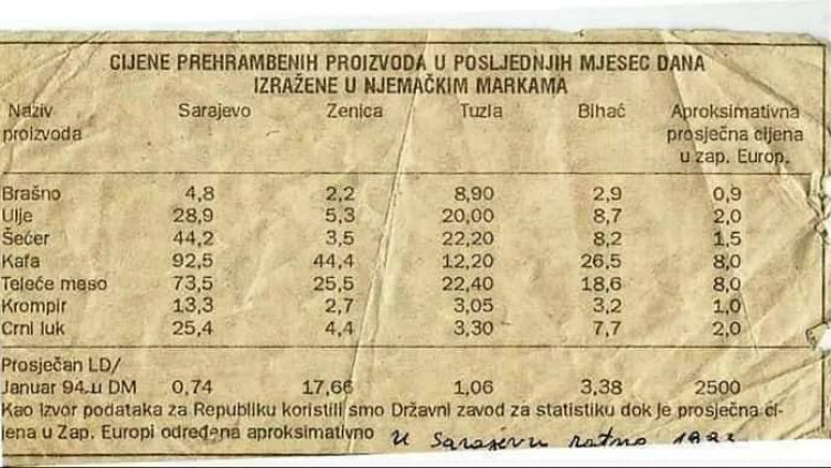 Popularna je iz tog vremena krilatica "nisam gladan, samo sam željan", a za onima koji ne mogu dokučiti kakva je neimaština možda je najbolje predočiti jednu davnu fotografiju, faksimil novinskog članka s početka 1994 o cijenama pregrambenih artikala izraženim u njemačkim markama.