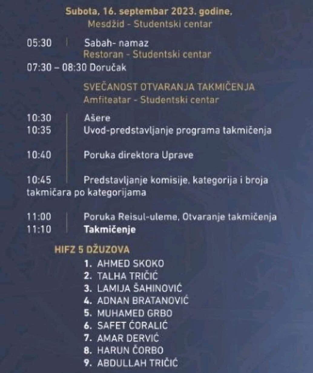 Riječ je o dvodnevnom takmičenju na kojem učestvuje 25 takmičara i takmičarki iz Bosne i Hercegovine, a održat će se u tri kategorije: 1) Hifz 5 džuzova; 2) Hifz 15 džuzova i 3) Hifz cijelog Kur'ana.