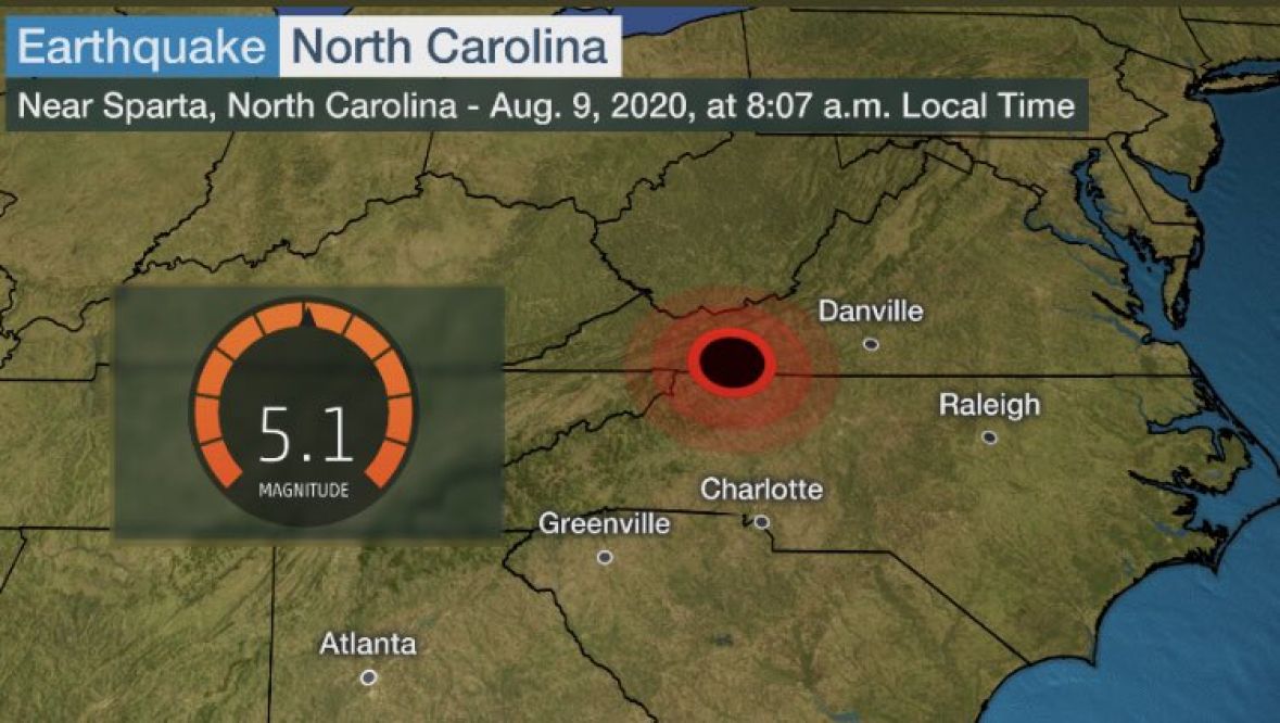 Nacionalna meteorološka služba u Greenvilleu saopćila je da je zemljotres jačine 5,1 stepen pogodio Sjevernu Karolinu u 8:07 sati po lokalnom vremenu, nakon čega je uslijedio niz potresa slabijeg intenziteta.