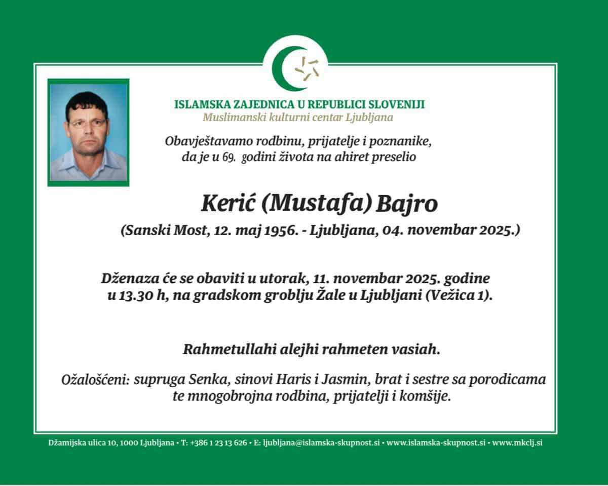 Obavještavamo rodbinu, prijatelje i poznanike, da je u 69. godini života na ahiret preselio Kerić (Mustafa) Bajro (Sanski Most, 12. maj 1956. – Ljubljana, 04. novembar 2025.)