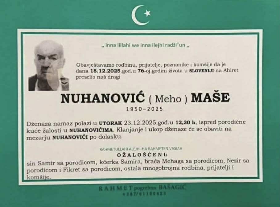 Dženaza-namaz polazi u utorak, 23.12.2025. godine, u 12.30 sati, ispred porodične kuće žalosti u Nuhanovićima. Klanjanje i ukop dženaze obavit će se na mezarju Nuhanovići, po dolasku.