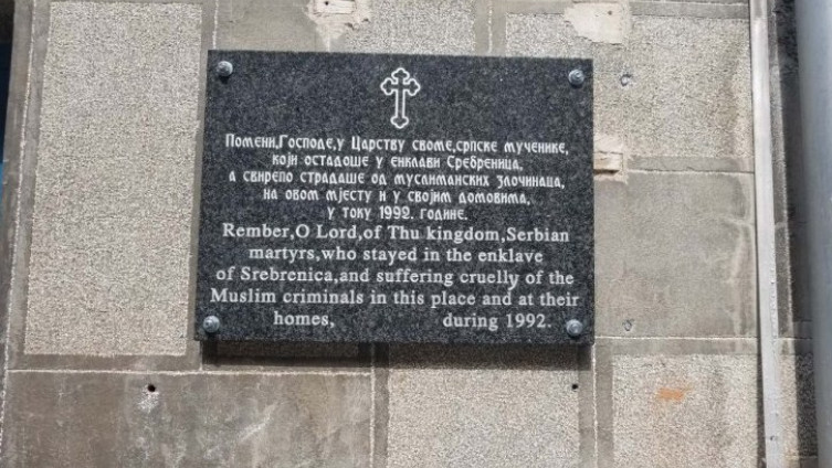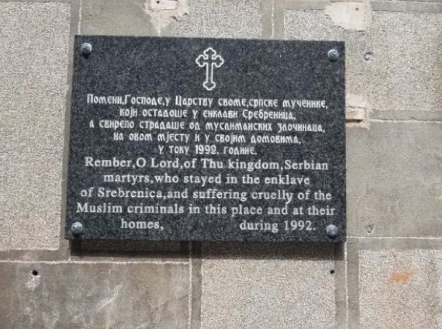 Name, u Srebrenici su danas na zgradi stare policijske stanice članovi srpskih udruženja iz Srebrenice ponovo postavili spomen ploču posvećenu "srpskim mučenicima koji su ostali u enklavi Srebrenica" i "svirepo stradali od muslimanskih zločinaca".