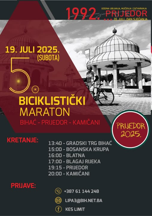 U subotu, 19. jula 2025. godine, sa Gradskog trga u Bihaću u 13:40 sati kreće peti po redu biciklistički maraton Bihać – Prijedor – Kamičani.