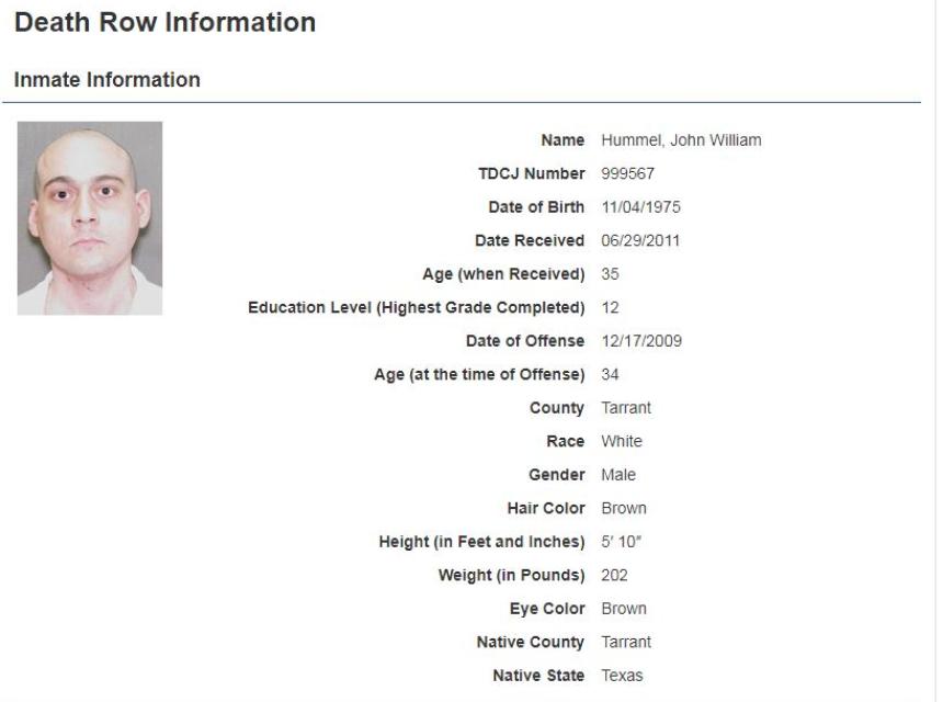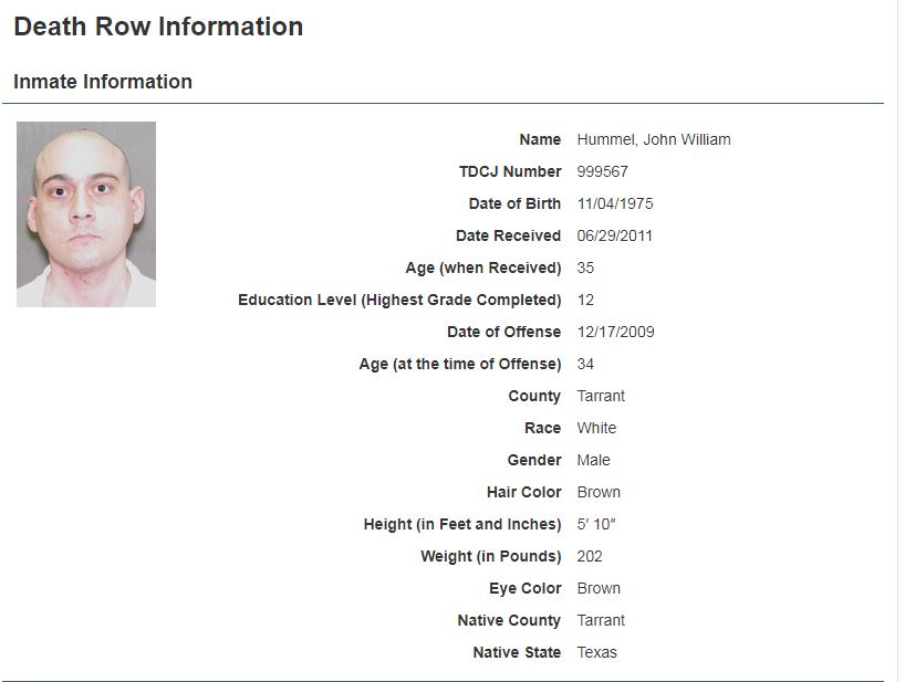 Hummel je 2009. godine nožem ubio svoju trudnu suprugu i njenog oca, a potom je bejzbol palicom nasmrt pretukao petogodišnju kćerku prije nego što je zapalio kuću.
