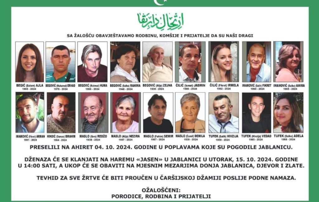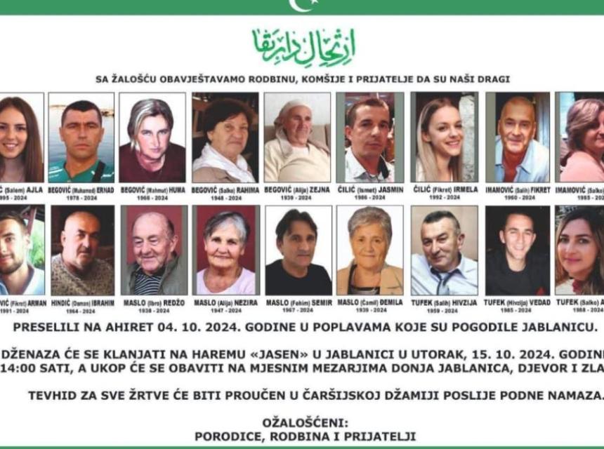 U utorak, 15. oktobra ove godine bit će klanjana dženaza svim žrtvama u Jablanici, tačnije, mještanima naselja Donja Jablanica i Zlate koji su svoje živote izgubili u katastrofalnim poplavama koje su prije nekoliko dana pogodile ovo i još nekoliko mjesta u Bosni i Hercegovini.