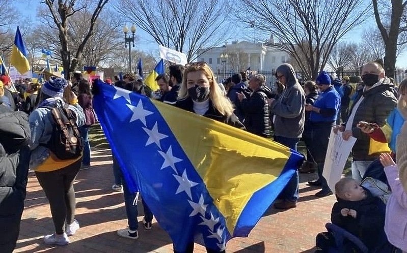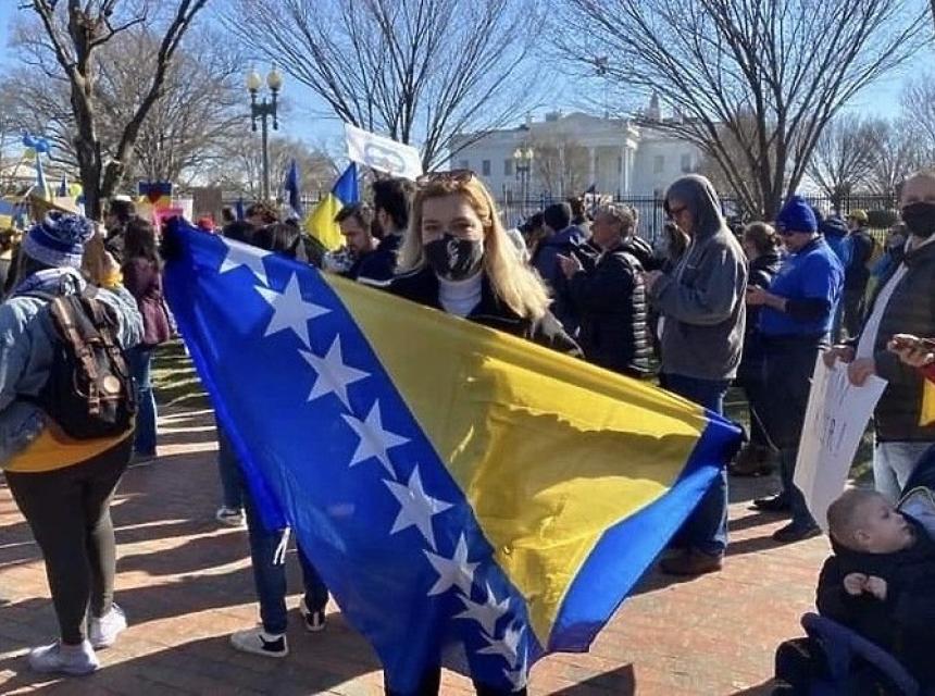 Među učesnicima demonstracija ispred Bijele kuće bila je i Andrea Pozderac iz Bosne i Hercegovine koja je sa zastavom svoje domovine pružila podršku Ukrajincima.