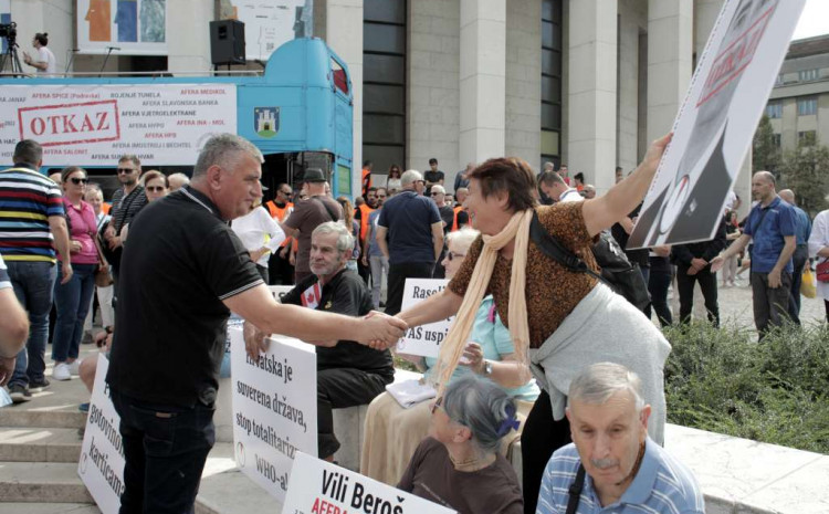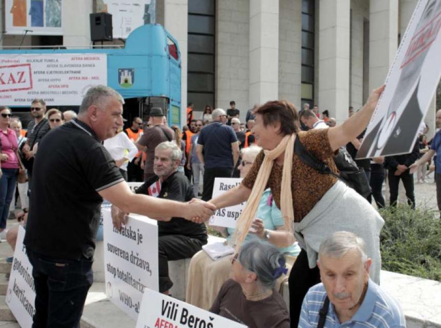 Oko fontane na Trgu žrtava fašizma okupilo se par hiljada osoba, koji nose transparente s porukama poput "Vlast proizlazi iz naroda i pripada narodu", "Opet ste pokrali Inu", "Raseljena mladost je vaš uspjeh" i "Visoke cijene energenata su umjetno stvorene".