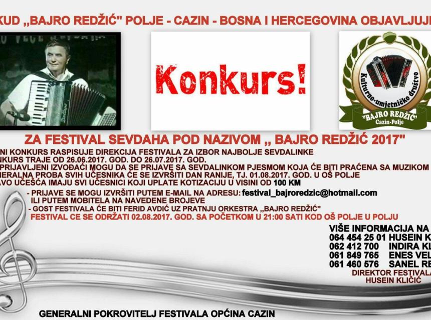 Kulturno-umjetničko društvo ,,Bajro Redžić” iz Polja, Cazin, ove godine organizira Festival sevdaha pod nazivom “Bajro Redžić 2017″.