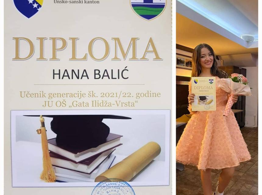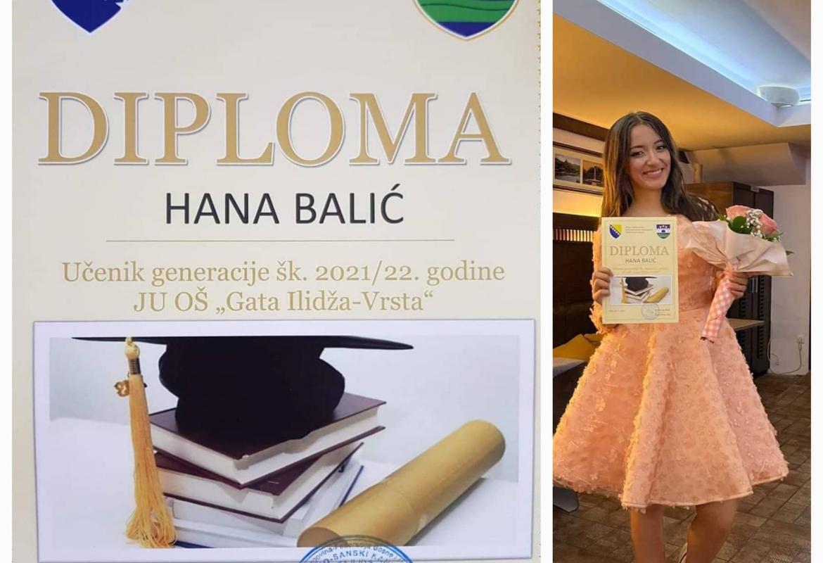 Radi se o učenici Hana Balić koja je odličnim rezultatima stvorila preduslove za nastavak školovanja i odabir zanimanja kojim će najbolje iskoristiti svoj potencijal, kako za sebe tako i za našu zajednicu kojoj su neophodni takvi kadrovi.