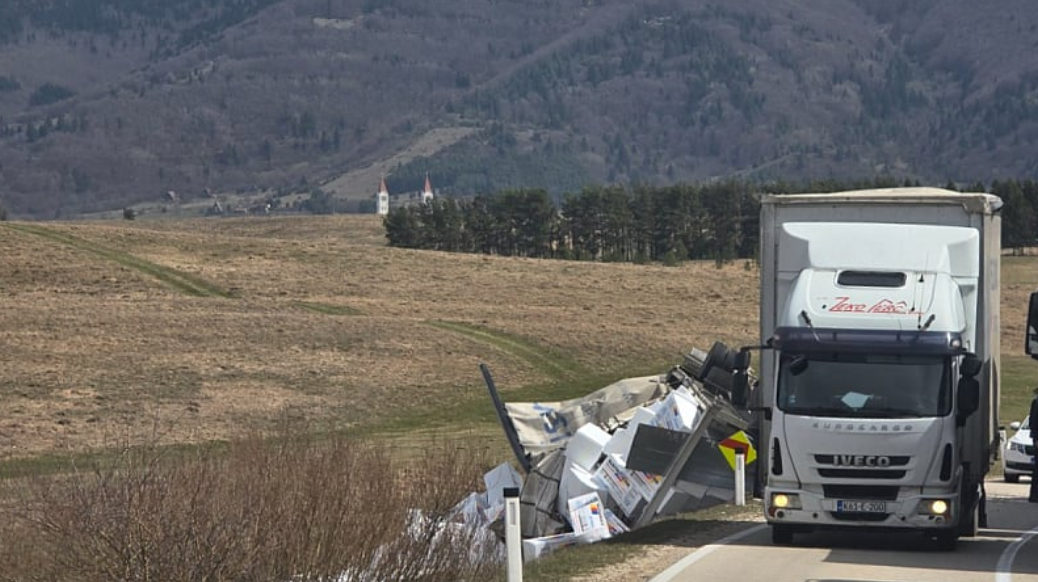 Na dionici magistralnog puta M-16 kod Kupresa, snažni udar vjetra danas je doveo do prevrtanja kamiona, čiji je teret završio razasut po cesti.
