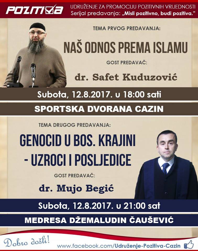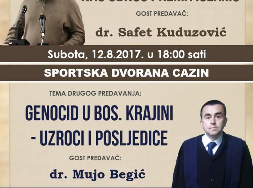 Sa početkom u 18 sati uvaženi dr. Safet Kuduzović, jedan od najpoznatijih predavača i daija naših prostora, govorit će na temu "Naš odnos prema islamu". Predavanje će se održati u Sportskoj dvorani Cazin.