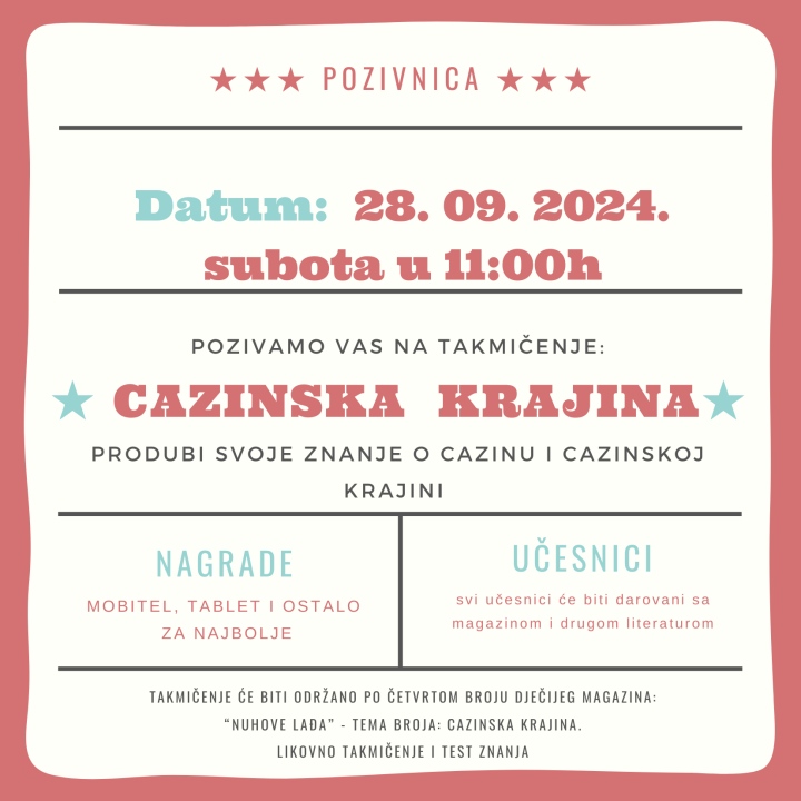 Što se tiče testa znanja, gradivo se nalazi u 4. broju dječijeg magazina “Nuhova lađa” i potrebno je da učite samo gradivo koje je vezano za Cazinsku krajinu, ostalo ne trebate učiti. Ukoliko nemate literaturu, javite se nama da vam pošaljemo u PDF-u ili možete preuzeti iskopirano kod aktivista udruženja “Pozitiva”. Ne bojte se, nema mnogo za učiti, ali potrebno je da to temeljito prođete, obratite pažnju i na slike.