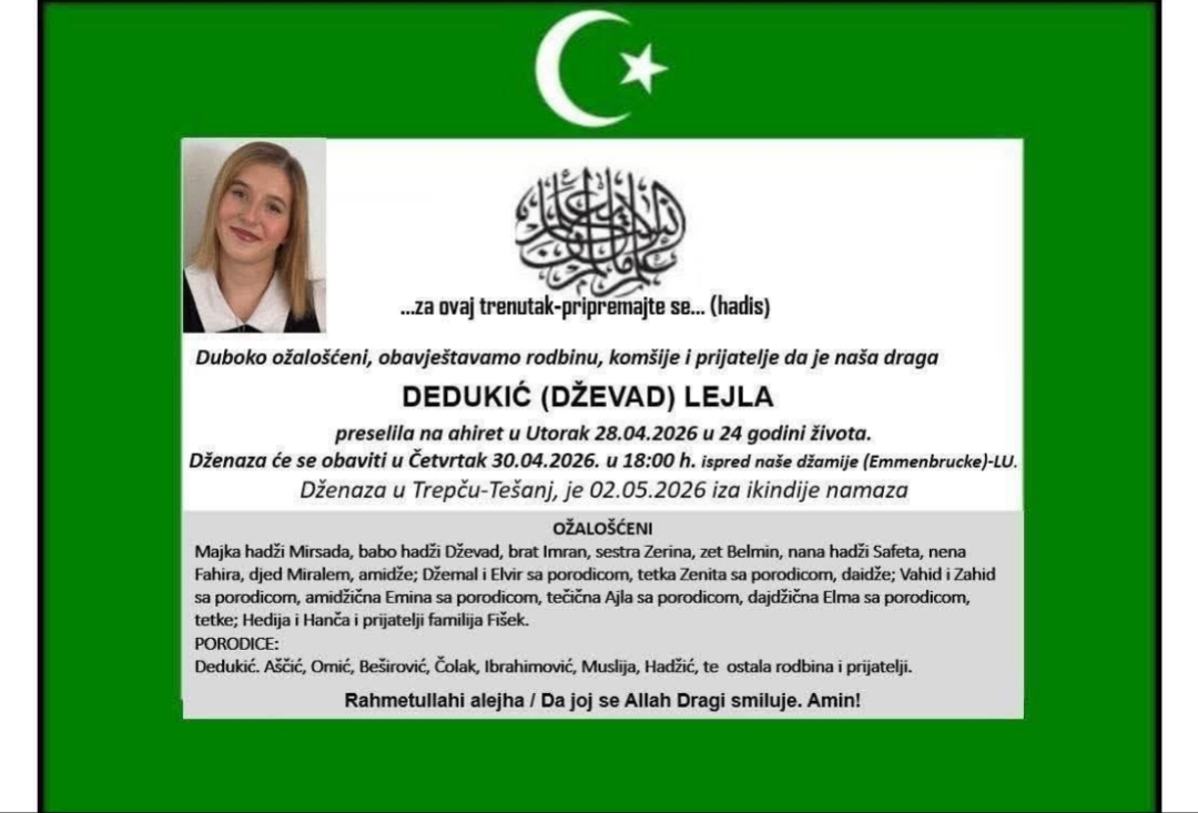 Dženaza-namaz bit će klanjana u četvrtak, 30. aprila 2026. godine u 18:00 sati ispred džamije u Emmenbruckeu (Luksemburg), dok će se ukop obaviti u Trepču kod Tešnja u nedjelju, 2. maja 2026. godine, nakon ikindije-namaza.