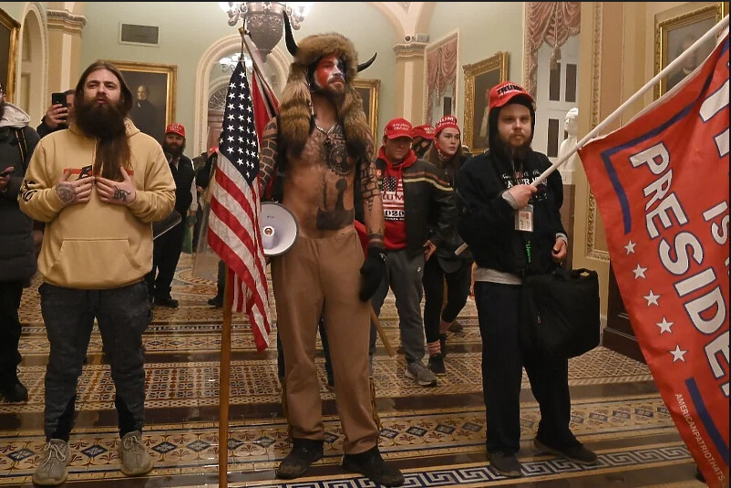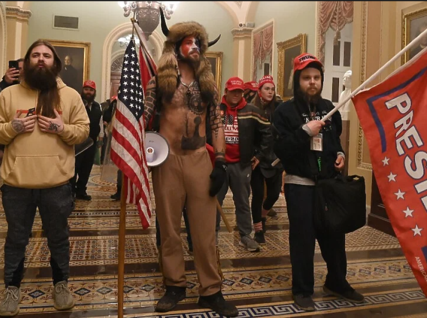 Chansley se može vidjeti na nekoliko fotografija bez majice i s rogovima, a u zgradi Capitola drži konfederacijsku zastavu.
