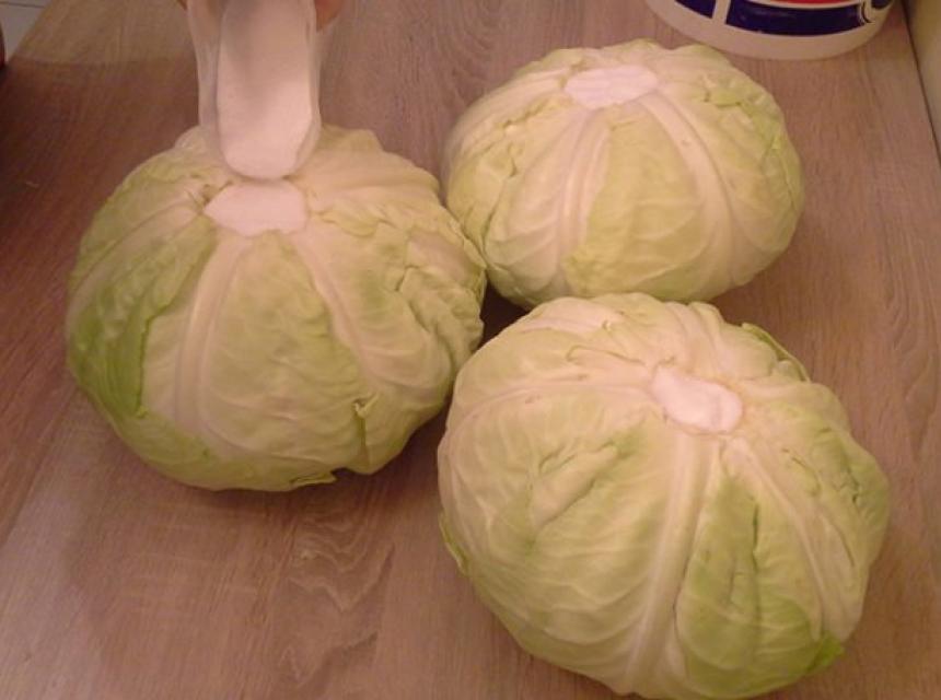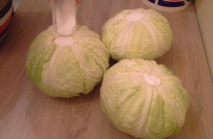Zreli kupus, čvrstih glavica, očistiti od oštečenih listova i oštrim nožem izdubiti “korjen”. Napravljeno udubljenje ispuniti solju. Na dnu bureta posuti so i na to slagati posoljene glavice kupusa.