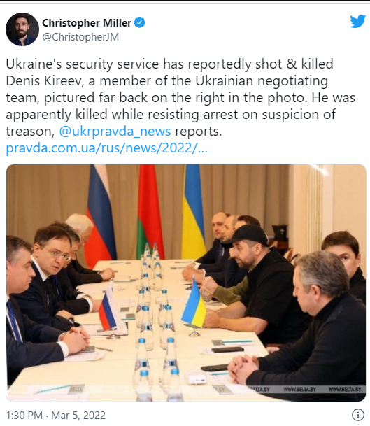 Ukrajinska služba sigurnosti (SBU) ubila je ukrajinskog pregovarača Denisa Kirejeva zbog sumnje na izdaju, piše ukrajinska “Pravda”.