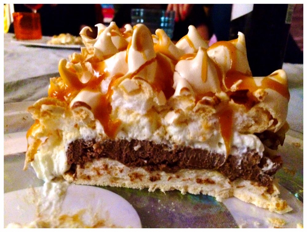 Izvadite iz rerne, stavite čvrst snijeg od bjelanaca koji ste izmiksali sa šećerom i pecite dok snijeg ne dobije zlatnu boju. Izrežite na kocke i prelijte karamelom.