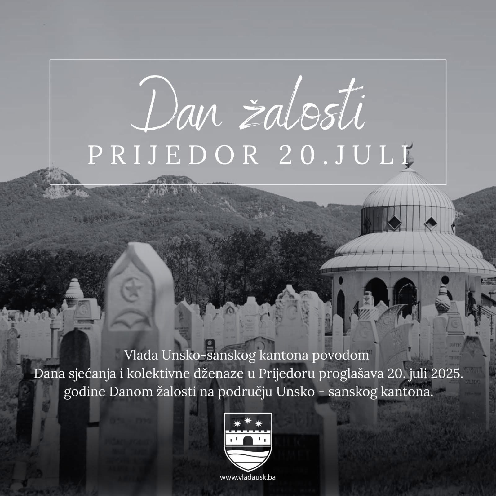 Vlada Unsko-sanskog kantona donijela odluku da 20. juli 2025. godine, bude proglašen Danom žalosti na području cijelog kantona, povodom Dana sjećanja i kolektivne dženaze žrtava ratnih zločina u Prijedoru.