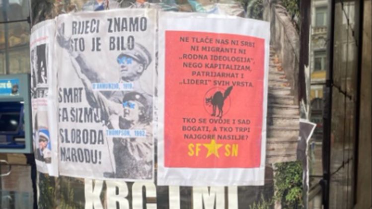 "Ne tlače nas ni Srbi, ni migranti, ni "rodna ideologija", nego kapitalizam, patrijarhat i "lideri" svih vrsta. Tko se ovdje i sad bogati, a tko trpi najgore nasilje. SFSN", stoji na drugom plakatu.