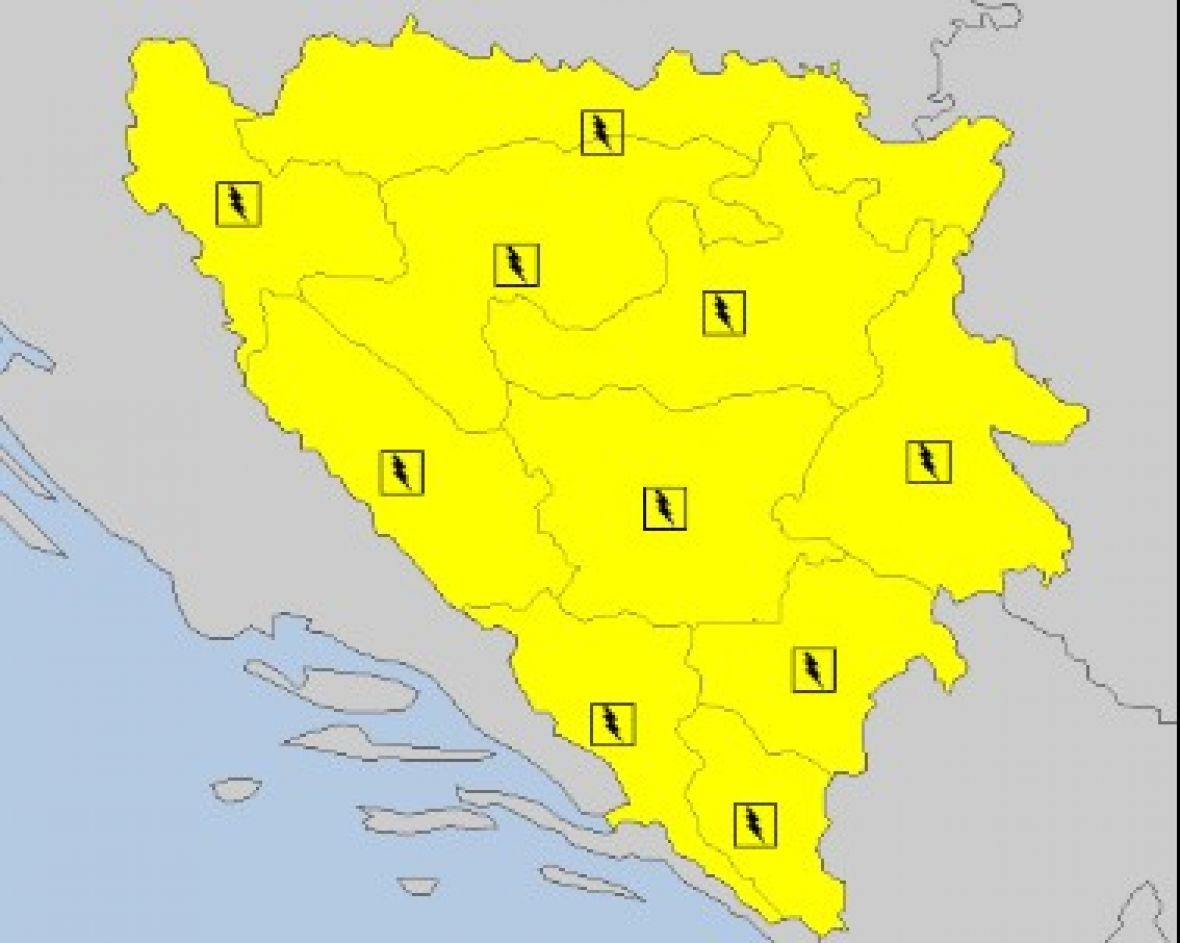 Danas se u našoj zemlji očekuje umjereno do pretežno oblačno i nestabilno vrijeme sa kišom, pljuskovima i grmljavinom. Na jugu Hercegovine bez padavina. Lokalno je moguće i jače grmljavinsko nevrijeme, praćeno intenzivnijim padavinama i gradom.