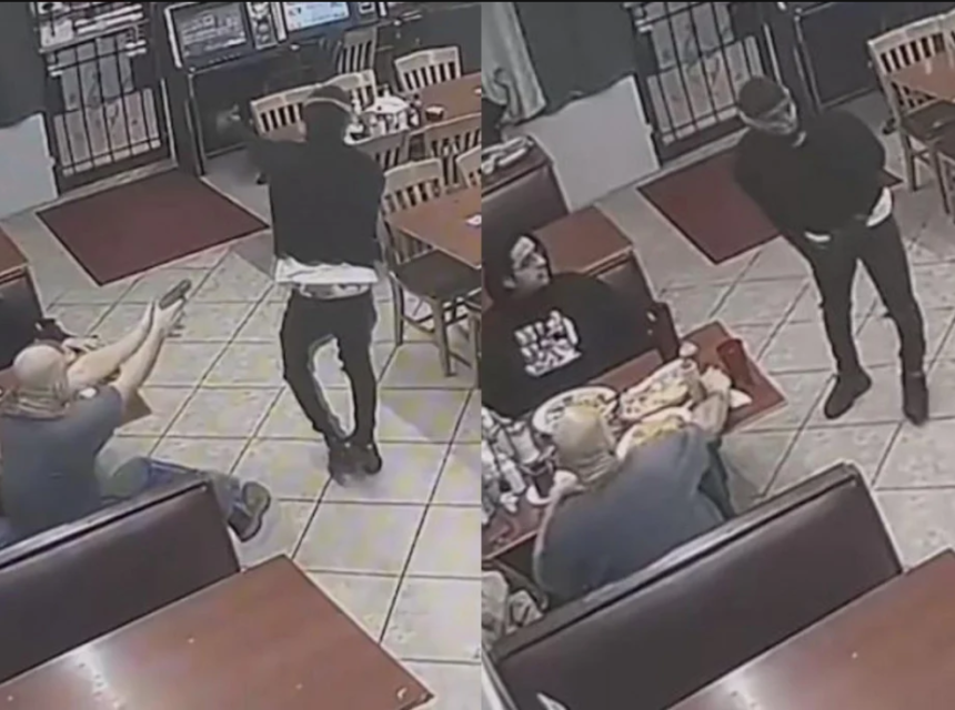 U trenutku kad je pljačkaš u dvadesetim godinama napuštao restoran jedan od gostiju je također posegnuo za pištoljem te u njega ispalio najmanje devet hitaca.
