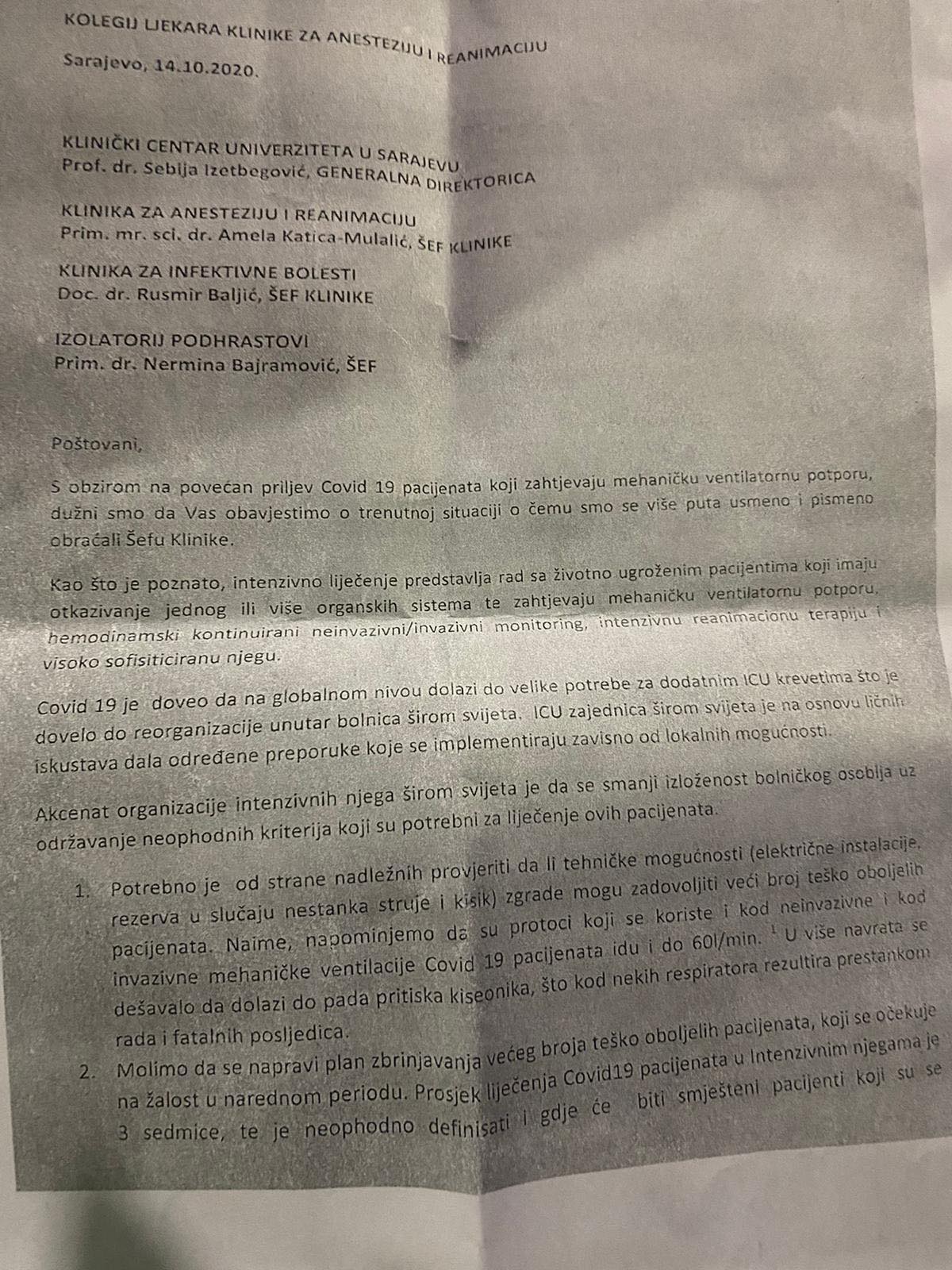 “S obzirom na povećan priljev Covid 19 pacijenata koji zahtjevaju mehaničku ventilatornu potporu dužni smo da Vas obavijestimo o trenutnoj situaciji o čemu smo se više puta usmeno i pismeno obraćali Šefu Klinike.