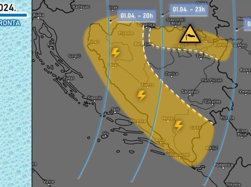Hladna fronta koja dolazi sa zapada donosi kišu i lokalno grmljavinsko nevrijeme, uz zahlađenje večeras. Kiša i lokalni pljuskovi s grmljavinom prvo će pogoditi područje sjeverozapadne i zapadne Bosne u intervalu od 20 do 21 sat.