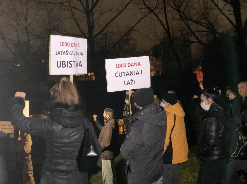 U prvim redovima nalazi se transparent s likom ubijenog mladića Davida Dragičevića s porukom "1000 dana zataškivanja ubistva", dok ostali drže manje parole na kojima između ostalog piše "1000 dana ćutanja i laži".