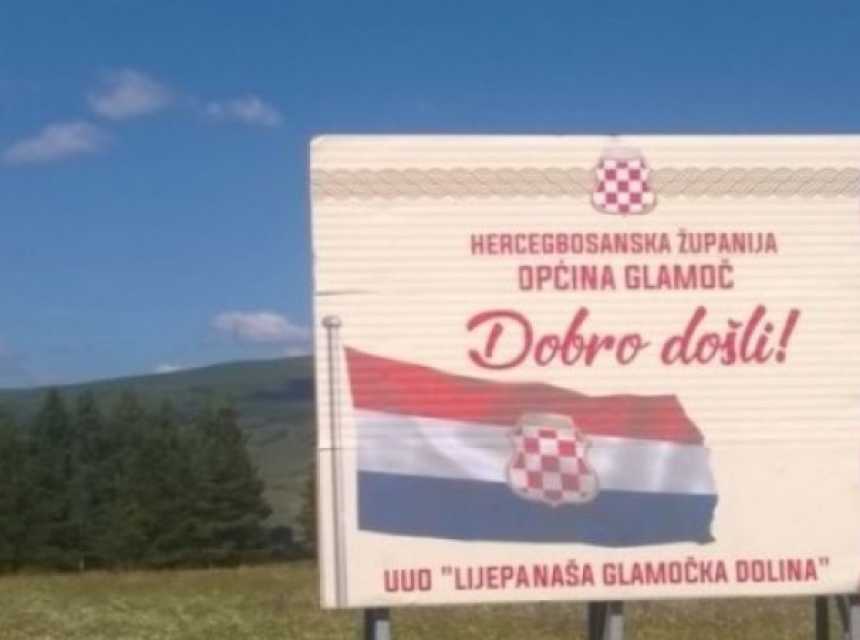 “Hercegbosanska županija, općina Glamoč. Dobro došli. Lijepa naša Glamočka dolina”, napisano je preko istaknute zastave hrvatskog naroda u BiH.