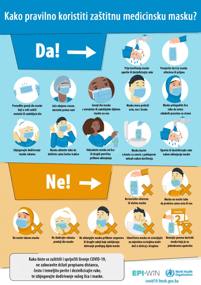 Posebno je opasno, navodi se u preporukama, nositi maske na vratu i dirati ih rukama. Dirati masku smijete jedino u dijelu vezica, koje kačite za uši.