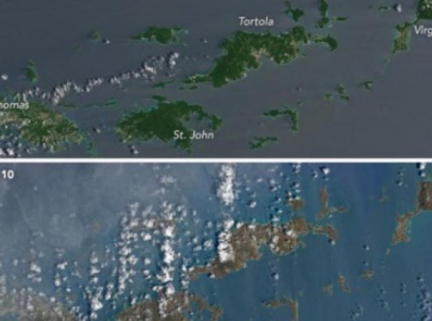 Kada se u nedjelju nebo pročistilo iznad otoka, satelit Landsat 8 zabilježio je promjenu boje. Uragan je čupao biljke, pa je od zelenih otoka ostala uglavnom zemlja. Čak je i boja okeana postala svjetlija.