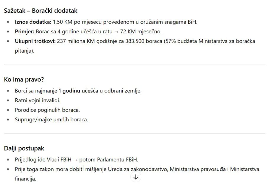 “Radna skupina predlaže da iznos za izračun boračkog dodatka bude 1,50 KM po provedenom mjesecu u oružanim snagama Bosne i Hercegovine.