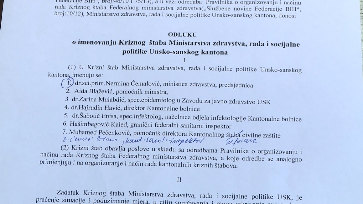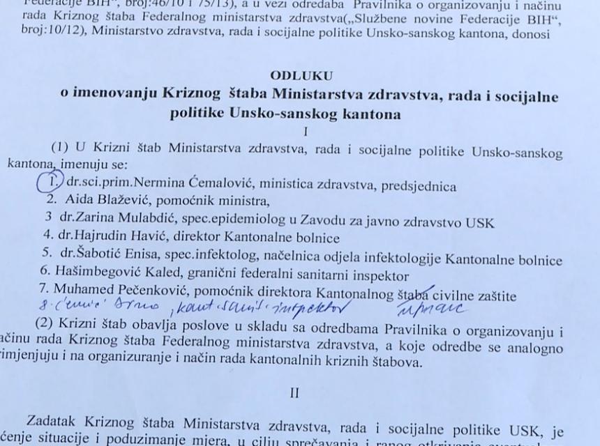 Članovi Štaba su epidemiolozi, sanitarni i granični inspektori, predstavnici Civilne zaštite, a na čelu je ministrica zdravstva, rada i socijalne politike USK-a Nermina Ćemalović.