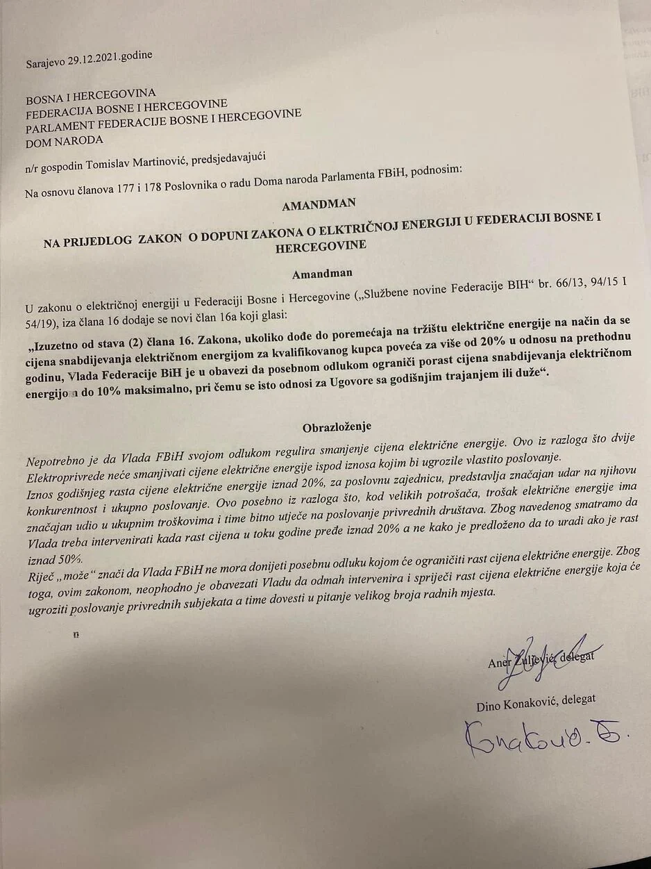 Kako saznajemo, zbog amandmana delegata Elmedina Konakovića i Anera Žuljevića Dom naroda FBiH usvojio je dugačiji tekst Zakona o električnoj energiji u odnosu na Predstavnički dom.