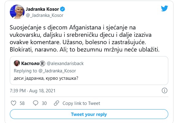 „Suosjećanje s djecom Afganistana i sjećanje na vukovarsku, daljsku i srebreničku djecu i dalje izaziva ovakve komentare. Užasno, bolesno i zastrašujuće. Blokirati, naravno. Ali; to bezumnu mržnju neće ublažiti“, poručila je Kosor.